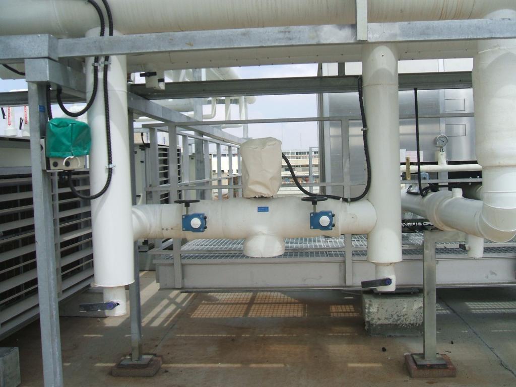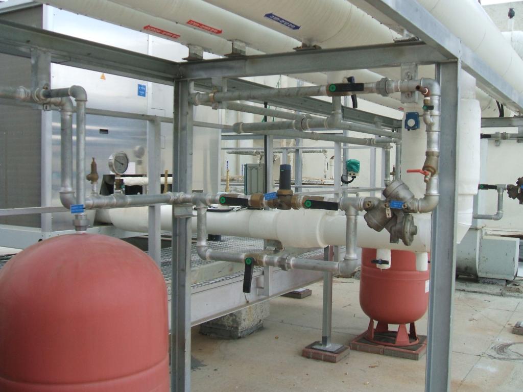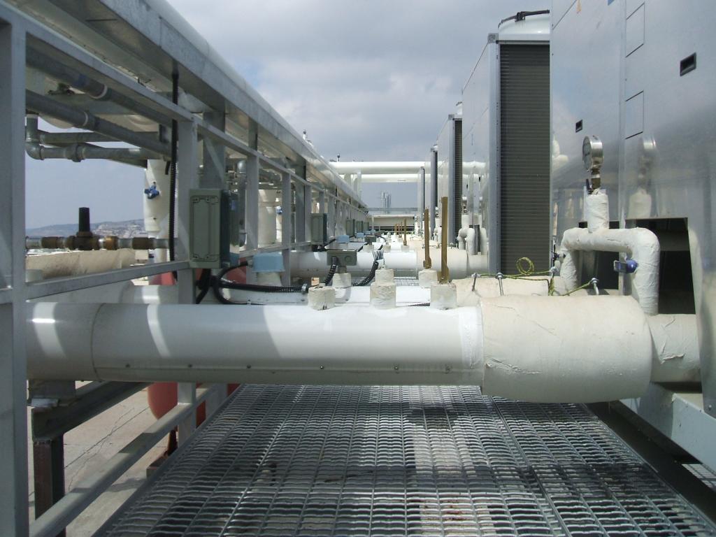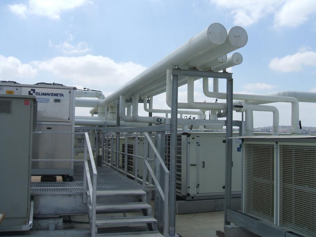 מרכז האנרגיה בגג כולל 5 יחידות קירור מים תוצרת climaveneta דגם:B 1104-NECS-ST אשר מחוברות למחלק מים קרים אחד בקוטר "10.